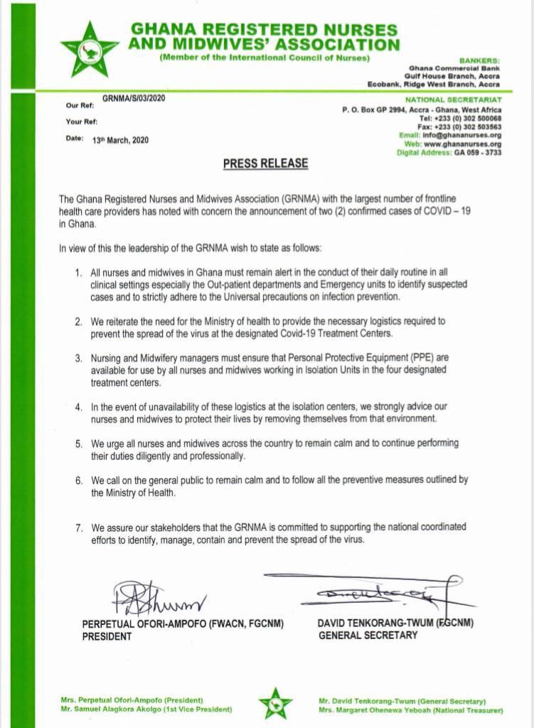 The Association in a release on Friday, March 13, 2020 said health officials must ensure that protective gears are made available to the nurses and midwives who will be on the frontline working in isolation units in the four designated treatment centres for Coronavirus in Ghana.
