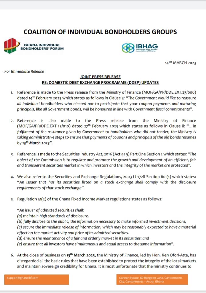 According to the coalition made up of the Ghana Individual Bondholders Forum and Individual Bondholders Association of Ghana, the coupon and principal payments have not been paid despite written press releases confirming the resumption of payments on 13th March 2023.