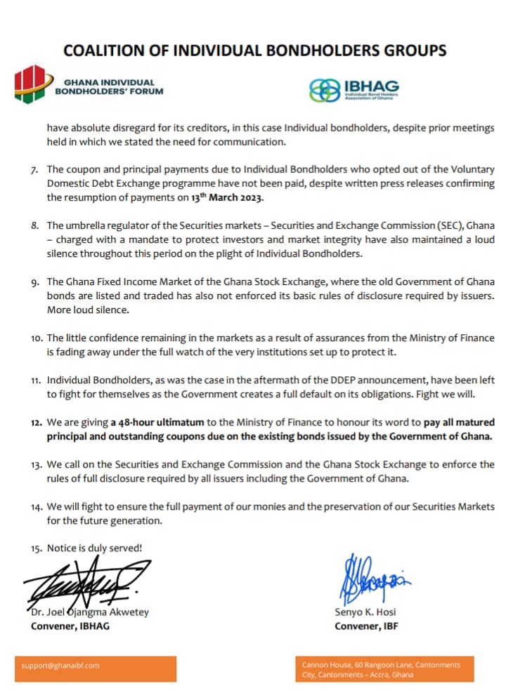 “We are giving a 48-hour ultimatum to the Ministry of Finance to honour its word to pay all matured principal and outstanding coupons due on the existing bonds issued by the Government of Ghana. We call on the Securities and Exchange Commission and the Ghana Stock Exchange to enforce the rules of full disclosure required by all issuers including the Government of Ghana,” the statement added.